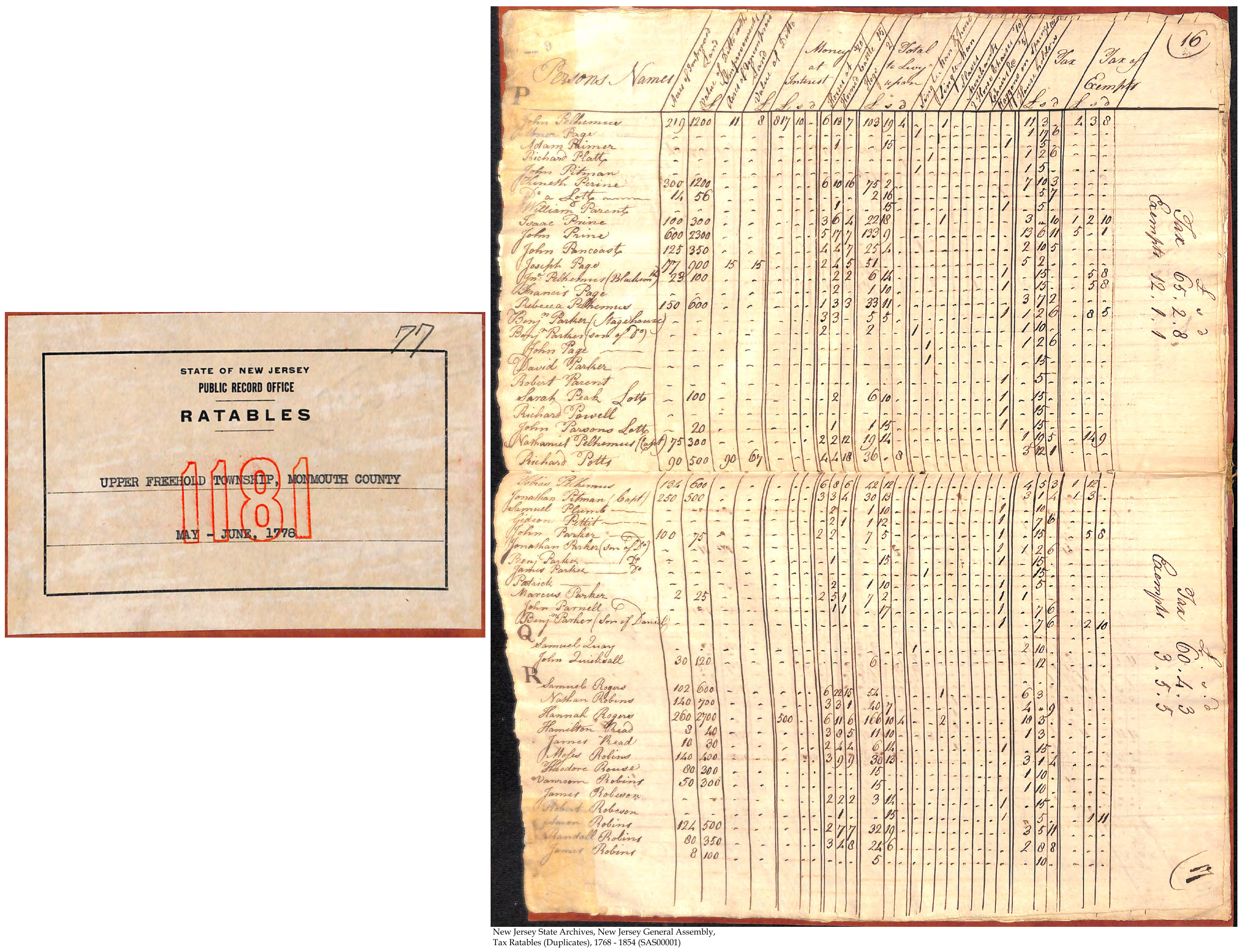 41.33 Moses Robins Father - 55.10 Zachariah Robins Mother - Mary Branson Timeline - c1740 Moses Robins purchases land on Main Street, Allentown, Monmouth County, New Jersey [1] 1741 living in Allentown, Monmouth County, New Jersey [1] 1 Jul 1741 Moses Robins purchases a farm near Allentown, Monmouth County, New Jersey from Thomas and Sarah Barnet [1] c1755 child #3, John King, born [1] 27 Jan 1762 Moses Robins makes inventory for estate of John Horsfull [7] 22 Feb 1763 Moses Robins sells land in Freehold Township, Monmouth County, New Jersey to John Cox Sr [1] [2] [4] Moses Robins purchases land in Upper Freehold Township, Monmouth County, New Jersey to John Cox Jr [1] [2] [4] 11 Oct 1764 Moses Robins makes inventory for estate of Mary Montgomery [7] 1775 living in Allentown, Monmouth County, New Jersey [1] Moses Robins died [1] 21 Aug 1775 administration of estate of Moses Robins assigned to John Polhemus [1] 1778 child #3, John King, living in Upper Freehold Township, Monmouth County, New Jersey [10] 3 Aug 1784 child #2, James, sells farm near Allentown, Monmouth County, New Jersey to child #3, John King [1] 23 May 1788 child #3, John King, sells farm near Allentown, Monmouth County, New Jersey to John Imlay [1] 20 Sep 1788 deed dated 23 May 1788 recorded [5] 10 Oct 1790 child #3, John King, died [1] Notes - Moses Robins worked as a tanner; lived on Main Street, Allentown, Monmouth County, New Jersey. [1] Child #2, James, married Eleanor ------. [1] Child #3, John King, worked as a cordwainer; [1] buried in Ye Olde Robbins Burial Place. [3] Questions - Citation #1 says Moses Robins (with others) applied to build a meeting house 2 Sep 1738, but other Citations say it was Moses Robins (82.5) who applied to build a meeting house. [8] Citation #9 gives a different account of Moses Robins. [8] Child #3, John King, could be confused with 55.11, child vii; or perhaps just some information is being confused. [8] Elizabeth Robins named in Citation #10 perhaps the widow of Moses Robins. [8] Extras - Info concerning Robins Burying Ground, Monmouth County, New Jersey, Misc->YeOldRobbinsBurialGround and Reference->82.5.txt [6] [8] Citations - 1. "Genealogical and Personal Memorial of Mercer County, New Jersey", Francis Bazley Lee, 1907, Biographies->9.312-2 2. state.nj.us, Reference->41.33.txt 3. "Robins/Robbins of New Jersey", Sara Robbins Hoffman (5.2188, child i) <july37@cox.net> and John William Taylor Jr, 2006 4. New Jersey State Archives Records Index, Reference->41.33.txt 5. Monmouth County, New Jersey Grantors' Index (Recorded) 6. Gary Dale Robins (0.2212, child i) <gdrobins@robinsgenealogy.net> 7. "Calendar of New Jersey Wills, Administrations, Etc.", Volume IV - 1761-1770, A. Van Doren Honeyman, 1928, Reference->41.33.txt 8. Marshall Edward Lake (1.0) <genealogy@mlake.net> 9. Sara Robbins Hoffman (5.2188, child i) <july37@cox.net>, 4 Sep 2007, Reference->41.33.txt 10. May-Jun 1778 Ratables, Upper Freehold Township, Monmouth County, New Jersey, Records->Misc->41.33.jpg Children: i. Moses. [1] ii. James. [1] iii. John King. [1] [10]