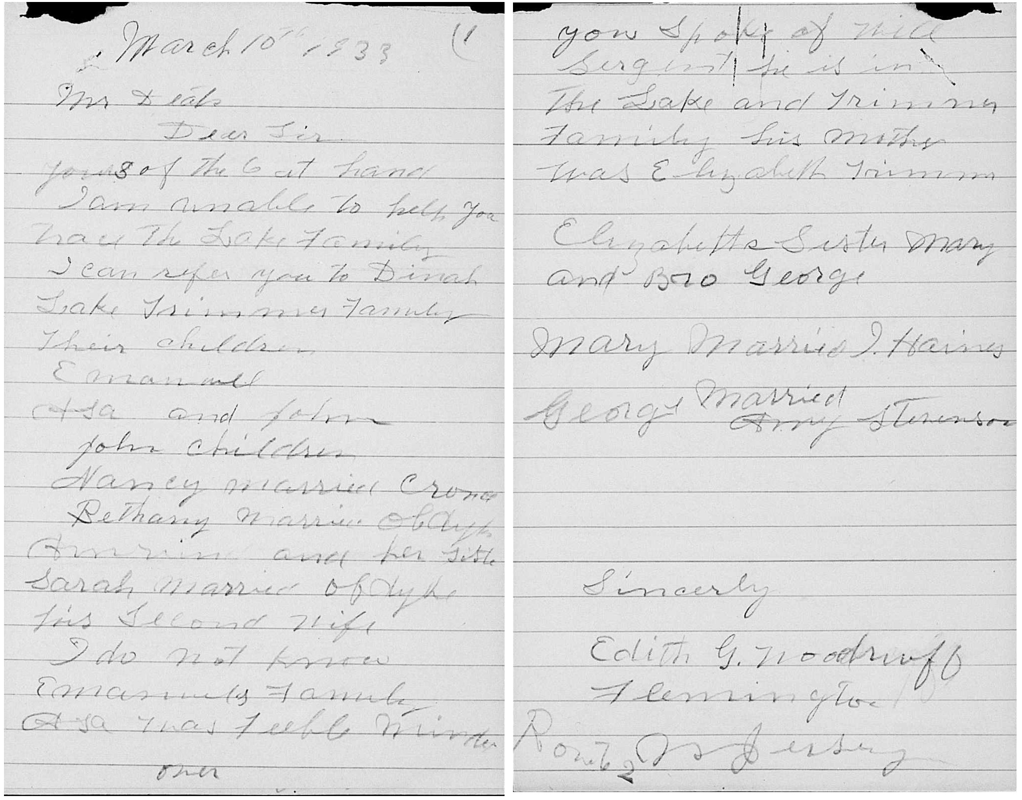 30.319 Margaret Lake Father - 41.47 John Lake Mother - 41.46 Sarah Ann Robins Timeline - 3 Dec 1767 Henry Trimmer born [9] in New Jersey [6] 25 Apr 1770 Margaret Lake born [3] [5] [8] [11] in Amwell Township, [5] Hunterdon County, New Jersey [5] [8] 1791 Joseph Opdycke born [1] c1796 child #1, Sarah, born [1] [6] in New Jersey [6] 9 Oct 1799 child #2, Asa, born [1] [9] in New Jersey [6] 6 Mar 1809 Henry Trimmer (and Cornelius Lake) assigned administration of estate of John Lake (41.47) [10] 3 May 1809 Henry Trimmer (and Cornelius Lake) swear to inventory of estate of John Lake (41.47) [10] 30 Oct 1813 child #1, Sarah, and Joseph Opdyke married [1] [6] in Hunterdon County, New Jersey by ------ Bartolette [6] 1846 Joseph Opdycke died [1] 1850 living in Delaware Township, Hunterdon County, New Jersey [6] Henry Trimmer working as a farmer [6] 5 Oct 1850 Henry Trimmer died [9] 22 Dec 1861 child #2, Asa, died [1] [9] Notes - Margaret Lake married Henry Trimmer. [2] [7] Henry Trimmer son of Johannes Trimmer and Susanah Servis; [2] [7] buried in Lower Amwell Cemetery, Delaware Township, Hunterdon County, New Jersey. [7] [9] Johannes Trimmer son of Johannes Trimmer and Elsa Catharina Engel. [6] Child #2, Asa, buried in Lower Amwell Cemetery, Delaware Township, Hunterdon County, New Jersey. [9] Questions - Citation #3 refers to Margaret Lake as Margarett. [4] Citation #6 and Citation #12 refer to Margaret Lake as Dinah, and Citation #7 refers to Margaret Lake as Dina; perhaps her name was Margaret Dinah or Dinah Margaret; perhaps Henry Trimmer married twice (see Citation #7), to Margaret and to Dinah. [4] Citation #9 refers to the wife of Henry Trimmer as Dinah Lake (died at age 90 years 2 months 15 days; buried in Lower Amwell Cemetery, Delaware Township, Hunterdon County, New Jersey). [4] From Citation #6 it appears that child #1, Sarah, had children: Henry (born c1833, married first Susan Case 15 May 1856, married second Mary J. Martin 14 Mar 1861) and Parthana L. (born c1838, married George M. Potts 1 Oct 1859). [4] Citation #1 refers to Joseph Opdyke as Joseph Opdycke. [4] Citation #6 refers to Opdyke as both Opdycke and Opdycke. [4] Citation #7 says Henry Trimmer died 1858. [4] Citation #12 seems to have a different take on the children, but it's difficult for me to exactly understand it. [4] Citations - 1. Marfy Goodspeed <marfyg@gmail.com>, https://goodspeedhistories.com/lake-family-tree/ 2. Reference->Misc->HunterdonCoLakes.txt 3. bible record, Records->Bible->41.46.jpg 4. Marshall Edward Lake (1.0) <genealogy@mlake.net> 5. Marguerite Joan Lake (3.2086) <hank-o@comcast.net> 6. Mary Jo C. Martin <martinsm@ocean.com.au>, 21 Mar 2003, Reference->30.319.txt 7. Marfy Goodspeed <marfy.goodspeed@gmail.com>, May/Jun 2009, Reference->110.93.txt 8. www.geni.com 9. enumeration of Lower Amwell Cemetery, Delaware Township, Hunterdon County, New Jersey 10. Documents Relating to the Colonial, Revolutionary & Post-Revolutionary History of the State of New Jersey, Volume XLI - Calendar of New Jersey Wills, Administrations, Etc., Volume XII, 1810-1813, Elmer T. Hutchinson, 1949, Reference->30.86.txt 11. Hunterdon County Historical Society, Flemington, New Jersey, Lake Folder 12. Hunterdon County Historical Society, Flemington, New Jersey, Lake Folder, Misc->30.319.jpg Children: i. Sarah. [1] [6] ii. Asa. [1] [6] [9]