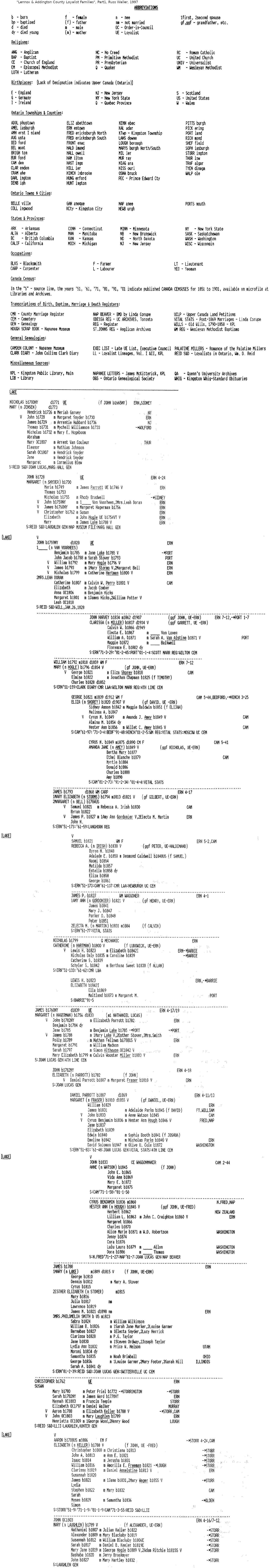 110.92 Hendrick Lake Father - 111.46 Nicholas Lake Mother - Mary Janszen Timeline - 1717 Hendrick Lake born [5] [12] in Gravesend, Kings County, [2] [13] New York [2] [12] [13] c1721 Mariah Gowey born [13] in Monmouth County, [13] New Jersey [2] [13] 1740 living in Middlesex County, New Jersey [10] [15] Mariah Gowey living in Middlesex County, New Jersey [10] [15] 21 Febd1739 Hendrick Lake and Mariah Gowey married [2] [10] [13] [14] [15] [16] [19] [24] in Middlesex County, [13] [14] [16] New Jersey [13] [14] [15] [16] 1752 child #1, Nicholas, born [2] [13] 1753 Hendrick Lake a freeholder in Somerset County, New Jersey [2] [11] [13] 1754 child #2, Polly, born [2] [13] 1756 child #3, Hannah, born [2] [13] 2 Jul 1761 Hendrick Lake, Hendrick Schnider (spouse of 110.8), John Wattack, John Johnson, Garret Williamson (brother of spouse of 110.3), Nathaniel Ackerley, Benjamin Abbot, William Taylor, Martinus Voorhies (father of first spouse of 109.19) and Daniel Hellenbeck petition for 10,000 acres in Albany County, New York [24] [26] 8 Jul 1761 petition dated 2 Jul 1761 referred [8] [24] [29] 5 Aug 1761 petition dated 2 Jul 1761 granted [8] [24] warrant for survey for petition dated 2 Jul 1761 issued [24] 24 Mar 1762 Hendrick Lake, Hendrick Schnider (spouse of 110.8), John Wattack, John Johnson, Garret Williamson (brother of spouse of 110.3), Nathaniel Ackerley, Benjamin Abbot, William Taylor and Martinus Voorhies (father of first spouse of 109.19) granted 10,000 acres in Albany County, New York [25] [26] [28] [29] 25 Sep 1762 Hendrick Lake secured lot #2 (160 acres) in land patent granted 5 Aug 1761 in Mapletown, Albany County, New York [11] 1763 Hendrick Lake a freeholder in Somerset County, New Jersey [11] 24 Mar 1763 article naming Hendrick Lake published in The Capitol [11] 1776 living in Albany County, New York [30] 1 Mar 1776 Hendrick Lake elected for Albany Committee of Correspondence [30] 2 Mar 1776 Hendrick Lake present on Albany Committee of Correspondence [30] 26 Apr 1776 Hendrick Lake present on Albany Committee of Correspondence [30] 1 Jul 1776 Hendrick Lake present on Albany Committee of Correspondence [30] 12 Jul 1776 Hendrick Lake present on Albany Committee of Correspondence [30] 1779 living in Town of Hoosick, Albany County, New York [32] 2 Mar 1779 Hendrick Lake taxed 6 pounds [32] 1783 Hendrick Lake working as a farmer [2] [11] [18] 6 Nov 1783 Hendrick Lake named as Administrator of estate of Mary Janszen (spouse of 111.1) [11] [18] 1786 living in Maple Town, Albany County, New York [2] [11] 22 Mar 1786 Hendrick Lake and Mariah Gowey sell [11] [13] 100 acres [11] in Town of Hoosick, Albany County, New York to Peter Van Ostrander [11] [13] 1790 living in Town of Hoosick, [11] Albany County, New York [2] [11] [13] 1794 living in Town of Hoosick, Rensselaer County, New York [2] [11] [13] [24] 28 Feb 1794 Hendrick Lake and Mariah Gowey sell 17 acres 24 rods in Town of Hoosick, Rensselaer County, New York to Robert Patton [11] [13] 3 Mar 1794 deed dated 28 Feb 1794 recorded [11] [13] 14 May 1795 deed dated 22 Mar 1786 recorded [11] 1798 living in Town of Hoosick, Rensselaer County, New York [24] 22 Jan 1798 Hendrick Lake and Mariah Gowey entrust land to Abraham Lake and Garret Lake [11] [24] 31 Jan 1798 Hendrick Lake signs over trust dated 22 Jan 1798 [24] 1799 living in Town of Hoosick, Rensselaer County, New York [2] [4] [7] [11] [17] [24] 2 Mar 1799 will of Hendrick Lake made [2] [4] [7] [9] [11] [13] [17] [21] [24] 1799 Hendrick Lake died [23] in Town of Hoosick, Rensselaer County, New York [13] 27 Jun 1799 will of Hendrick Lake proved [2] [11] [13] [17] 1 Jul 1799 will of Hendrick Lake sealed [7] [17] Jan 1822 land purchased 24 Mar 1762 sold [28] Notes - Hendrick Lake known as "Henry"; [2] [7] [9] [10] [11] [12] [15] [17] [18] [19] [23] [24] [30] [32] slave-owner. [2] [11] [13] Mariah Gowey known as "Mary"; [7] [9] [10] [11] [17] [19] [24] died in Rensselaer County, New York. [13] Questions - Citation #2, Citation #13, Citation #24 and Citation #31 say Hendrick Lake born 1726. [3] Citation #23 says Hendrick Lake born 1719. [3] Citation #13 says child #4, Henry, born 11 Apr 1761 in Albany, Albany County, New York; died 24 Sep 1851 (but that seems to be confused with 109.24). [3] Citation #6 refers to Hendrick Lake as Henrick; born 1726 in Monmouth County, New Jersey. [3] Citation #9 refers to Mariah Gowey as Mary Hui. [3] Citation #31 refers to Mariah Gowey as Meriah Garvey. [3] Citation #23 says Mariah Gowey born 1717. [3] Citation #10, Citation #14 and Citation #15 refer to Mariah Gowey as Mary Holwey. [3] Citation #24 refers to Gowey as both Gowey and Guey. [3] Citation #16 refers to Mariah Gowey as Mary Hoewey. [3] Citation #16 refers to Hendrick Lake as Henery. [3] Citation #7 refers to Hendrick Lake as Henry Leake. [3] Citation #22 gives a different account for this family. [3] Citation #27 indicates Hendrick Lake may have served during American Revolutionary War. [3] Extras - In one place in Citation #30 Hendrick Lake is shown as Henry L. Leake, and he signed by mark. [3] Citations - 1. Donna Mohney <dmohney@westol.com>, 23 May 1999 2. freepages.genealogy.rootsweb.ancestry.com, <walkers@vaix.net>, Reference->113.txt 3. Marshall Edward Lake (1.0) <genealogy@mlake.net> 4. Annette (Findley) Truesdell (3.600, child i) <atrue@garlic.com>, 19 Jun 2018, Reference->109.24.txt 5. <huskers@srv.net>, 30 Jan 1999 6. Kathleen Gagon, 937 North 200 East, American Fork, Utah 84003, <kgagon1@enol.com>, 801-756-4492 7. will abstract for Hendrick Lake (110.92), Records->Wills->110.92.jpg and Reference->110.92.txt 8. Calendar of Council Minutes, NY, HC Burleigh Papers (page 9), Herbert C. Burleigh (3.2454, child i), Misc->113.pdf 9. Annette (Findley) Truesdell (3.600, child i) <atrue@garlic.com>, 11 May 2020, Reference->109.11.txt 10. "New Jersey Marriages 1665-1800", William Nelson, 1900 11. Annette (Findley) Truesdell (3.600, child i) <atrue@garlic.com>, 11 May 2020, Reference->110.92.t