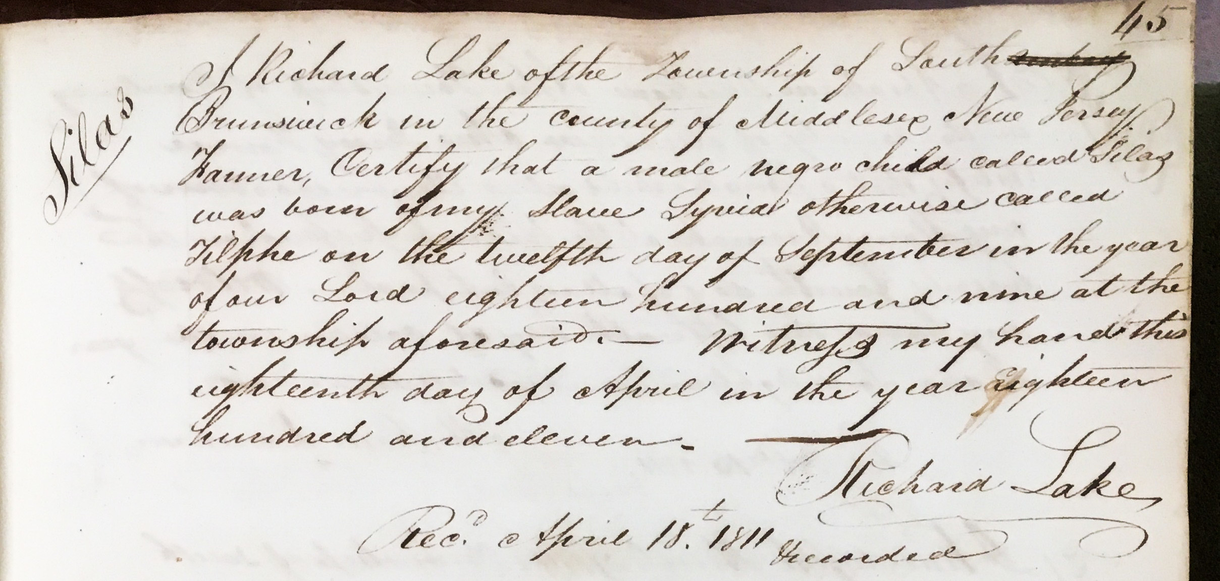 110.43 Richard Lake Father - 111.3 John Lake Mother - Martinah ------ Timeline - 6 Feb 1730 Richard Lake born [3] [9] [11] [13] [14] [18] in New Brunswick, [9] [14] [18] Middlesex County, New Jersey [9] [11] [14] [18] 26 Feb 1757 child #1, Sarah, born in New Brunswick, Middlesex County, New Jersey [9] 9 Nov 1759 child #2, John, born [3] in New Brunswick, Middlesex County, New Jersey [9] 25 Feb 1762 child #3, Anne, born [3] 27 Aug 1764 child #4, Benjamin, born [3] [9] in New Brunswick, Middlesex County, New Jersey [9] 18 Oct 1767 child #5, Deborah, born [3] [15] in New Brunswick, Middlesex County, New Jersey [9] [15] 16 Jul 1770 child #6, Amy, born [3] [9] in New Brunswick, Middlesex County, New Jersey [9] 26 Jul 1773 child #7, James, born [3] [9] [15] in New Brunswick, Middlesex County, New Jersey [9] [15] 1778-1780 living in South Ward, New Brunswick, Middlesex County, New Jersey [7] [15] 29 Mar 1780 child #8, Richard, born [3] 19 Dec 1782 child #9, Gideon, born [3] 9 Oct 1784 child #10, Daniel, born [3] 27 Mar 1791 child #2, John, died in New Brunswick, Middlesex County, New Jersey [9] 4 Dec 1794 child #11, Eleanor, born [3] 28 Aug 1796 child #12, James, born [3] 7 Sep 1800 child #13, Joseph, born [3] 1811 Richard Lake working as a farmer [20] living in South Brunswick Township, Middlesex County, New Jersey [20] 24 May 1813 Richard Lake named in will of Samuel Groenendyke, South Brunswick Township, Middlesex County, New Jersey [8] 1821 living in South Brunswick Township, [17] [19] Middlesex County, New Jersey [3] [17] [19] 21 Aug 1821 will of Richard Lake made [3] [17] [19] 9 Jan 1822 Richard Lake died in New Brunswick, Middlesex County, New Jersey [14] 19 Jan 1822 Richard Lake buried in New Brunswick, Middlesex County, New Jersey [9] 4 Mar 1823 child #12, James, and Anne Green married [3] 1825 child #14, Nancy, and Lawrence Crips married in Richmond County, New York [12] 29 Dec 1850 child #7, James, died in New Brunswick, Middlesex County, New Jersey [9] Notes - Richard Lake married Hannah ------; [5] [6] [15] [16] slave owner. [20] Child #15, Nancy, known as "Polly". [12] Questions - Citation #1 says Richard Lake married name unknown in Georgia; Citation #1 may be confusing Richard Lake with 28.2. [4] Citation #2 says Richard Lake born 1716. [4] Citation #6 says Richard Lake born c1740. [4] Citation #9 says Hannah ------ born 1732 Middlesex County, New Jersey; died 17 Jan 1776 in New Brunswick, Middlesex County, New Jersey. [4] Citation #9 erroneously says child #1, Sarah, born 26 Feb 1857 in Brunswick, Middlesex County, New Jersey. [4] Citation #9 and Citation #15 say child #2, John, born 19 Nov 1759. [4] Citation #9 and Citation #15 say child #14, Nancy, born 25 Feb 1762 in New Brunswick, Middlesex County, New Jersey; perhaps child #3, Anne, is really Nancy Anne and child #14, Nancy, does not exist. [4] Citation #3 refers to Crips as Cripps. [4] Citation #13 says Richard Lake married Elizabeth Wort. [4] Citation #15 says Richard Lake born 1764; died 1838. [4] The event "1825 child #14, Nancy, and Lawrence Crips married in Richmond County, New York" doesn't seem correct based upon a record in "Staten Island - Moravian Church, Marriages 1764-1863" which reads "1825 16 Jun; Lawrence Crips (aged wid); *Polly Lake* (yd d of *William Lake*)". Also, "Collections of the New York Genealogical and Biographical Society", Vol IV, Staten Island Church Records, 1909 says: "1825. June 16. Lawrence Crips, and aged widower Polly Lake, single, dau. of William Lake. Md. at Parsonage". [4] Citation #19 names a child, Rachel Ann, however, I think Rachel Ann is more likely a granddaughter of Richard Lake and a daughter of Daniel Lake (109.88). Citation #19 says Rachel Ann Lake born c1823 in New Jersey, married Edward Brewer (born c1814) in Somerset County, New Jersey Mar 1839, living in South Brunswick Township, Middlesex County, New Jersey 1850, had children: William (born c1841), James (born c1848) and George (born 1850). [4] Citations - 1. William R. Phillips, 4414 Gailwood Avenue, Memphis, Tennessee 38122, 901-761-5875, 30 May 1995 2. Marlene LaChapelle <mjsgram@home.com>, 12 Feb 1999 3. "A Personal Narrative of Some Branches of the Lake Family in America", Devereux Lake (5.1938), 1937 4. Marshall Edward Lake (1.0) <genealogy@mlake.net> 5. https://www.ancestry.com.au/genealogy/records/benjamin-lake-24-21lpk7k 6. Helen Wenta <wentahj@execpc.com>, 10 Jul 2000, Reference->110.43.txt 7. "Revolutionary Census of NJ", Kenn Stryker-Rodda, 1972, Reference->110.43.txt 8. will abstract, Reference->110.43.txt 9. Helen Wenta <helenwenta@comcast.net>, 31 Mar 2008, Reference->111.3.txt 10. "Album of Genealogy and Biography Cook County, Illinois", Calumet Book & Engraving Co, 1896, Biographies->17.356-2.jpg 11. HowardTejchma61 (extracted by Craig Kanalley <ckanalley@gmail.com> (0.0.0.216) from ancestry.com Apr 2020) 12. http://www.bklyn-genealogy-info.com/, Reference->110.43.txt 13. Jean Banowit <jeanbanowit@aol.com>, 1 Sep 2022, Reference->110.43.txt 14. wikitree.com 15. Ceil Leedom <mcleedom@comcast.net>, 18 Apr 2003, Reference->109.85.txt 16. Christina Wooley <harleyferrets@yahoo.com>, 17 Apr 2003, Reference->109.85.txt 17. Middlesex County Heirs to Estates 1780-1870, Reference->110.43.txt 18. www.geni.com 19. rootsweb.com 20. slave birth record, Records->Births->110.43.jpg Children: i. Sarah. [3] [9] [15] ii. John. [3] [9] [15] iii. Anne. [3] 109.85 iv. Benjamin. [3] [5] [6] [9] [10] [14] [15] [16] 109.87 v. Deborah. [3] [9] [15] 109.86 vi. Amy. [3] [9] [11] [15] vii. James. [3] [9] [15] viii. Richard. [3] ix. Gideon. [3] 109.88 x. Daniel. [3] [17] [19] xi. Eleanor. [3] xii. James. [3] xiii. Joseph. [3] xiv. Nancy. [3] [9] [15]