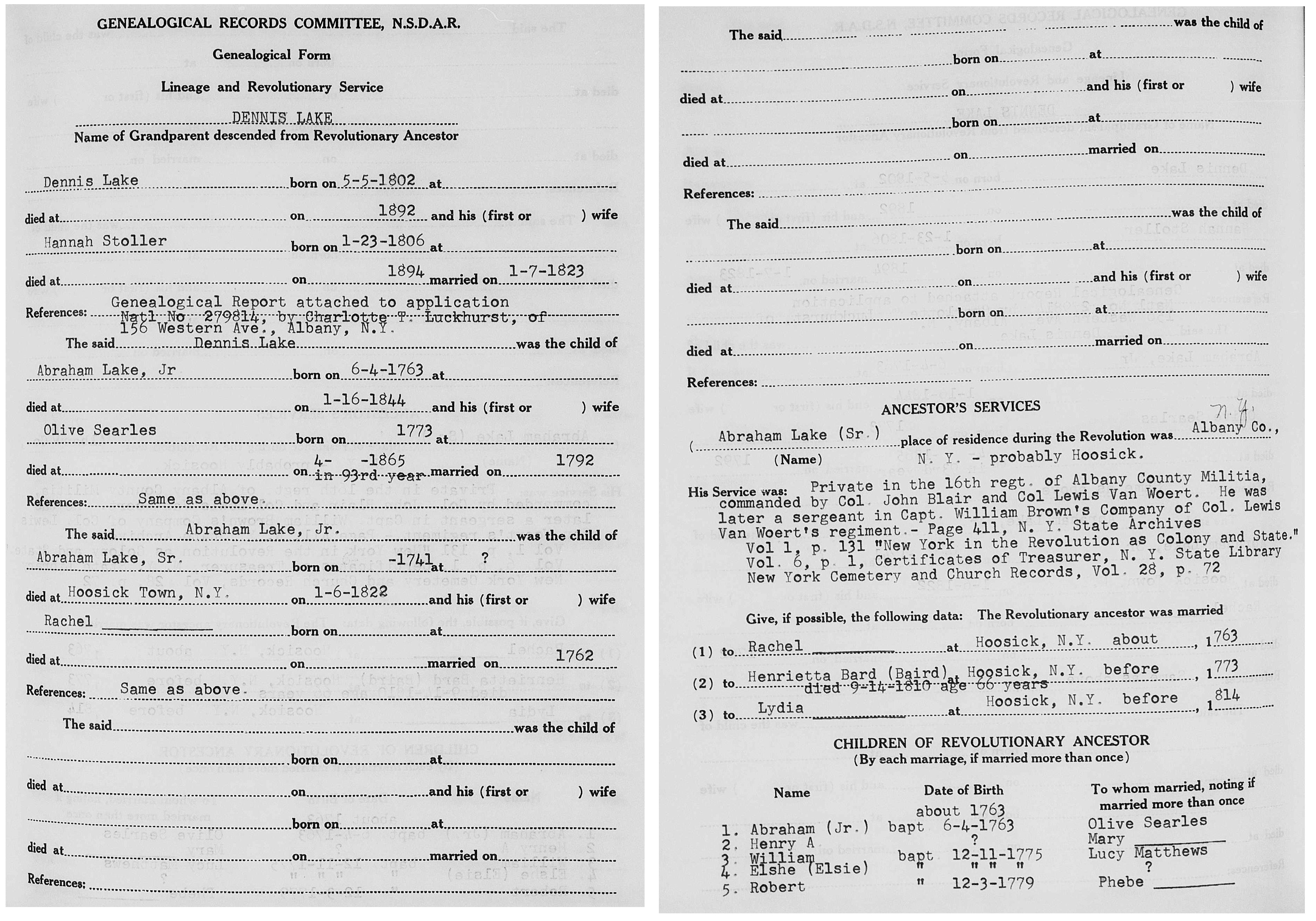 109.136 Abraham Lake Father - 110.11 Abraham Lake Mother - Henrietta Beard Timeline - 12 Jun 1767 Abraham Lake baptized [1] [4] in Dutch Reformed Church [4] 1773 Olive Searle born [12] 1792 Abraham Lake and Olive Searle married [4] [12] Abraham Lake serving as Ensign with Washington County Militia, New York [3] 7 Sep 1793 will of George Searle made [4] 8 Mar 1794 will of George Searle proved [4] 1798 Abraham Lake serving as Ensign with Montgomery County Militia, New York [3] living in Johnstown, Montgomery County, New York [6] 27 Feb 1799 Abraham Lake appointed to a committee supporting the ticket for the friends of gevernment [6] 23 Apr 1799 article naming Abraham Lake published in The Albany Centinel, Albany, New York [6] 1802 Abraham Lake serving as Lieutenant with Montgomery County Militia, New York [3] 5 May 1802 child #4, Dennis, born [12] 3 Apr 1804 Abraham Lake named in probate of estate of Henry Matthews, Johnstown, Montgomery County, New York [10] 23 Jan 1806 Hannah Stoller born [12] 1810 living in Montgomery County, New York [4] [11] 11 Feb 1811 Abraham Lake resigns from Montgomery County Militia, New York [3] [7] 1814-1816 living in Johnstown, Montgomery County, New York [4] [6] 1814 Abraham Lake a Captain [6] 13 Nov 1814 Abraham Lake purchases land in Town of Hoosick, Rensselaer County, New York from William Lake [4] 31 Dec 1814 Abraham Lake appointed Chairman of meeting for purpose of raising troops [6] 12 Jan 1815 article concerning Abraham Lake published in The Evening Post, New York City, New York [6] 1820 Abraham Lake member of Agricultural Society of Montgomery County, New York [8] living in Johnstown, Montgomery County, New York [8] 18 Oct 1820 Abraham Lake elected to Committee on Animals, Agricultural Society of Montgomery County [8] 4 Nov 1820 article mentioning Abraham Lake published in The Plough Boy, Albany, New York [8] article mentioning child #3, Harriet, published in The Plough Boy, Albany, New York [8] 7 Jan 1823 child #4, Dennis, and Hannah Stoller married [12] 3 May 1823 Abraham Lake named in deed, Montgomery County, New York [9] 1830 living in Johnstown, Montgomery County, New York [4] 10 Jan 1844 Abraham Lake died [2] [4] May 1865 Olive Searle died [12] Mayc1890 article naming Abraham Lake published in Fulton County Republican, Johnstown, New York [6] 1892 child #4, Dennis, died [12] 1894 Hannah Stoller died [12] Notes - Olive Searle daughter of George Searle. [4] Explanations - It appears (from the wording in Timeline event dated 11 Feb 1811) that Abraham Lake had been promoted to Captain sometime before he resigned from the Montgomery County Militia. [5] Questions - Citation #12 says Abraham Lake died 16 Jan 1844. [13] Citation #12 refers to Searle as Searles. [13] Citation #12 says the mother of Abraham Lake is Rachel ------. [13] Citation #12 says Abraham Lake baptized 4 Jun 1763. [13] Citations - 1. freepages.genealogy.rootsweb.ancestry.com, <walkers@vaix.net>, Reference->113.txt 2. The New England Historical and Genealogical Register, Reference->110.11.txt 3. "Military Minutes of the Council of Appointment of the State of New York, 1783 - 1821", Hugh Hastings & Henry Harmon Noble, 1901, Reference->110.11.txt 4. message exchange, Reference->110.11.txt 5. Marshall Edward Lake (1.0) <genealogy@mlake.net> 6. articles, Newspapers->Misc->109.136.jpg, Newspapers->Misc->109.136-2.jpg and Newspapers->Misc->109.136-4.jpg 7. https://montgomery.nygenweb.net/regiments/earlymilitias.html 8. articles, Newspapers->Misc->109.136-3.jpg and Newspapers->Misc->109.136ch-iii.jpg 9. deed, Records->Deeds->109.136.jpg 10. deed, Records->Misc->109.136.jpg 11. 1810 census 12. Genealogical Records Committee, N.S.D.A.R., Misc->109.136.jpg 13. Marshall Edward Lake (1.0) <genealogy@mlake.net> Children: i. Elizabeth. [4] ii. Jane. [4] iii. Harriet. [4] iv. Dennis. [4] [12] v. William. [4] vi. Sara. [4] vii. Benjamin. [4] viii. George. [4] ix. Elleanor. [4] x. Catharine Mary. [4]