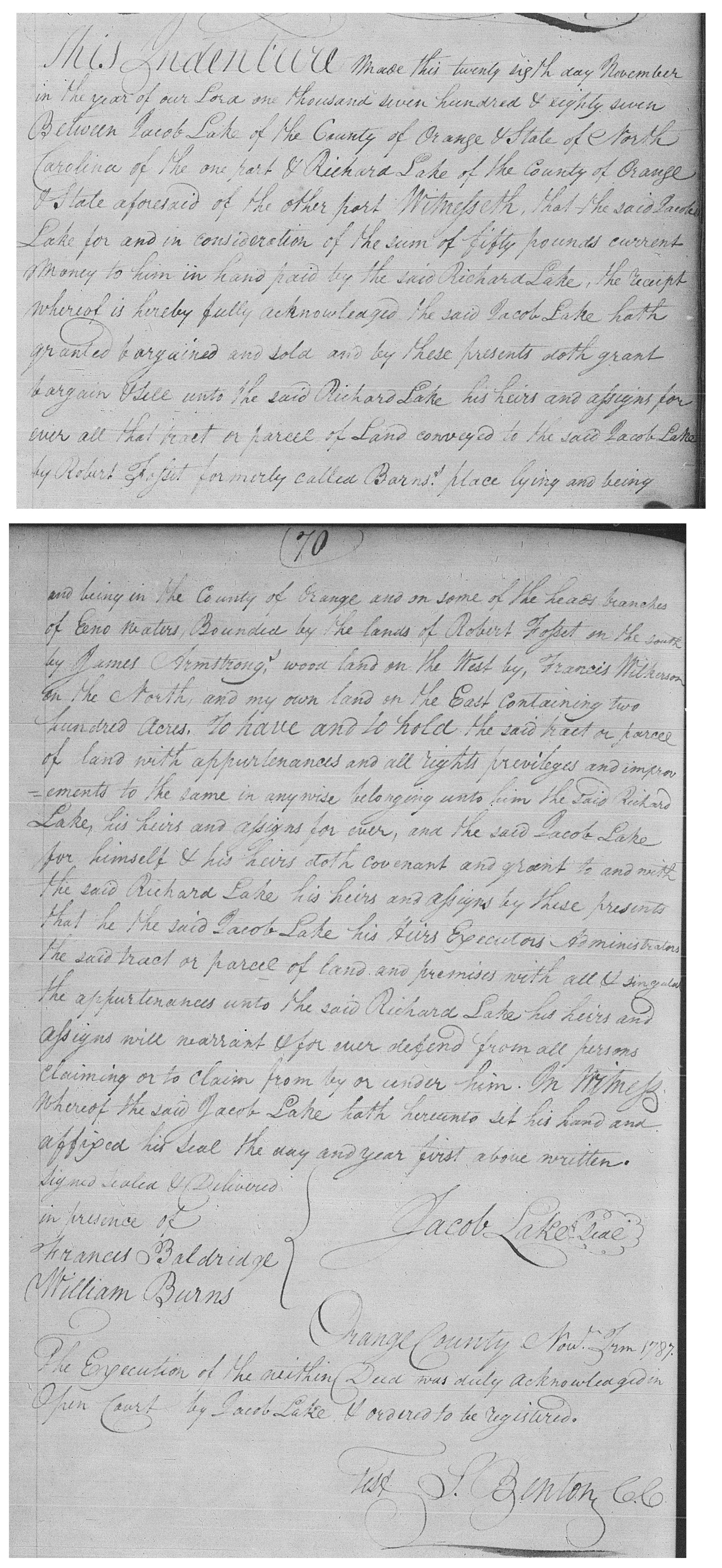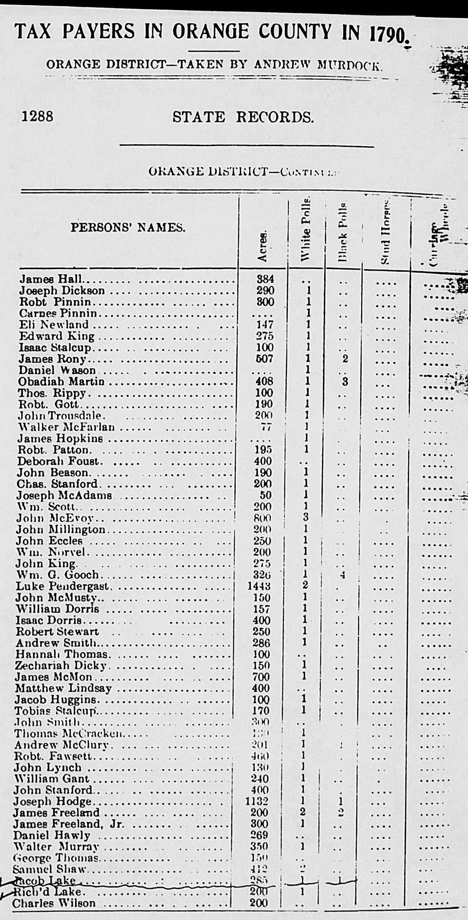 109.205 Jacob Lake Father - 110.0 Thomas Lake Mother - 110.1 Eleanor ------ Timeline - 12 Sep 1682 Frederick Debow born in Albany, New York [14] 11 Jun 1693 Johanna Van Hook born in New York City, New York [14] 1714 Solomon Debow born in New Jersey [14] 1748 Jacob Lake born [2] [3] [25] [27] in Bethlehem Township, [2] [3] [27] Hunterdon County, New Jersey [2] [3] [25] [27] 25 Sep 1750 Mary Debow born in Bethlehem Township, Hunterdon County, New Jersey [3] [11] [27] 10 Mar 1756 Johanna Van Hook died in Freehold Township, Monmouth County, New Jersey [14] 19 Dec 1757 Frederick Debow died in Freehold Township, Monmouth County, New Jersey [14] 1767 Solomon Debow died in North Carolina [14] 1770 Jacob Lake and Mary Debow married [3] in New Jersey [27] child #1, Lucy, born [3] 1771 Robert Pallet born in Virginia [1] 1772 child #2, Nancy, born [3] [10] in Hunterdon County, New Jersey [10] 1776 child #3, Anna, born [3] [10] in Hunterdon County, New Jersey [10] 1779 living in Orange County, [25] North Carolina [14] [25] 1780 child #4, Jenny, born [3] [10] 1782 child #5, Polly, born [3] [10] 1783-1790 Jacob Lake working as minister for New Hope Church, Chapel Hill, Orange County, North Carolina [8] [25] 1784-1792 Jacob Lake working as minister for Hawfields Presbyterian Church, Piedmont, North Carolina [9] [24] 1786-1794 Jacob Lake working as minister for Eno Presbyterian Church, Cedar Grove, North Carolina [7] 1787 living in Orange County, North Carolina [13] [31] 28 Nov 1787 Jacob Lake sells 200 acres in Orange County, North Carolina to Richard Lake (28.2) [13] [24] [31] May 1788 Jacob Lake assigned as minister in Orange County, North Carolina [18] 1788 Jacob Lake serving as minister in Orange County, North Carolina [16] 8 Feb 1789 child #6, Daniel Thatcher, born [6] 1790 living in Hillsborough District, [13] [33] Orange County, North Carolina [13] [14] [25] [32] [33] Jacob Lake owns 1 slave [13] May 1790 Jacob Lake sells land in Bethlehem Township, Hunterdon County, New Jersey to Ebenezer Stiltson (spouse of 28.150) and Hanah Lake [28] 19 Apr 1793 Jacob Lake sold land to Hannah Lake (110.0, child v) [29] 1795 child #7, Allen Debow, born [10] c1795 Mary Debow died [3] in Orange County, North Carolina [3] [27] 20 May 1795 Jacob Lake mentioned in deed, Orange County, North Carolina [30] 7 Sep 1796 Jacob Lake (et al) withdrew from Abingdon Presbytery to form the Independent Presbytery of Abingdon [17] 1797 living in Sullivan County, Tennessee [25] moved to Smith County, Tennessee [24] 21 Nov 1797 Jacob Lake reinstated from suspension [21] 1798-1799 Jacob Lake serving as a minister in Abingdon, Tennessee [15] c1800 child #1, Lucy, and Robert Pallet married in Tennessee [1] 1800 moved to Sullivan County, Tennessee [24] 31 Aug 1801 Jacob Lake and Susannah Williams married in Jefferson County, Tennessee [3] [19] 14 Jul 1817 will of Jacob Lake made [12] 1818 Jacob Lake died in Smith County, Tennessee [25] 18 Aug 1818 will of Jacob Lake proved [12] [24] Notes - Jacob Lake a Reverend; [3] [7] [15] [25] [27] [29] organized Taylor's Meeting House 4 miles west of Blountville, Tennessee before 1777; [20] [22] first Presbyterian Minister to ever preach in east Tennessee. [22] Mary Debow daughter of Solomon Debow and Hannah [2] [24] [27] Thompson. [2] [27] Solomon Debow son of Frederick Debow and Johanna Van Hook. [14] Extras - Additional info. [21] Frederick Debow and Johanna Van Hook are likely the same couple as M. Frederick De Boogh and Johanna VanHook (parents of spouse of 55.26). [5] Explanations - Citation #15 states (for the Abingdon Presbytery in 1798) "Rev. Jacob Lake, late of Orange." I believe that's good evidence that the Rev Jacob Lake who served in Orange County, North Carolina is the same person who served in Tennessee. [5] Questions - Citation #2 and Citation #3 say Jacob Lake died 18 Aug 1818 in Carthage, Smith County, Tennessee. [5] Citation #4 says Mary Debow born 1754. [5] Citation #10 says Mary Debow born in Caswell, North Carolina. [5] Citation #10 says child #1, Lucy, born 1780 in North Carolina. [5] Citation #10 says child #4, Jenny, born in Hunterdon County, New Jersey. [5] Citation #10 says child #5, Polly, born in Hunterdon County, New Jersey. [5] Citation #3 refers to Mary Debow as Mary DeBow. [5] Citation #11 says Mary Debow died 16 Jan 1827 in Hillsboro, Caswell County, North Carolina. [5] Citation #16 says that Jacob Lake reinstated from a suspension 1798. [5] Citation #23 indicates Solomon Debow died 25 Mar 1783, but perhaps the Solomon Debow in Citation #23 is the son of Solomon Debow. [5] Perhaps Jacob Lake is Jacob L. Lake. [5] Citation #26 says Jacob Lake born 1744. [5] I suspect "Joseph Lake" named in Citation #21 is an error in transcription and should be "Jacob Lake". [5] Citation #27 says Jacob Lake and Mary Debow married 1769. [5] Citation #27 says Mary Debow died 1794, but if child #7, Allen Debow, born 1795 is correct then Mary probably did not die in 1794. [5] Hanah Lake named in Timeline event dated May 1790 likely 109.0, child vi. [5] Citation #29 says Jacob Lake moved to Orange County, North Carolina 1784, but it's more likely he moved in 1782 or 1783. Citation #29 also says Jacob Lake and Richard Lake (28.2) moved together. [5] Citations - 1. Reference->Misc->HunterdonCoLakes.txt 2. Venita Lake <vlake@mindspring.com>, 9 Oct 2016, Reference->109.205.txt 3. Carol Malito, https://worldconnect.rootsweb.com/trees/380906/I109526406/reverandjacob-lake/individual 4. Marguerite Joan Lake (3.2086) <hank-o@comcast.net>, 17 Jun 2018 5. Marshall Edward Lake (1.0) <genealogy@mlake.net> 6. Clifton Wingard (3.2283, child i) <cwingard55@gmail.com>, headstone for Daniel Tatcher Lake (28.3), Reference->28.3.txt and Misc->Headstones->28.3.jpg 7. "History of Eno Presbyterian Church, Cedar Grove, North Carolina 1755-1980", Mrs. A. A. Ellis & T. C. Ellis, 1933, last updated 1980, Mrs. R. W. Isley 8. "Historical Sketch of New Hope Church, in Orange County, NC", Rev. D. I. Craic, 1891 9. 