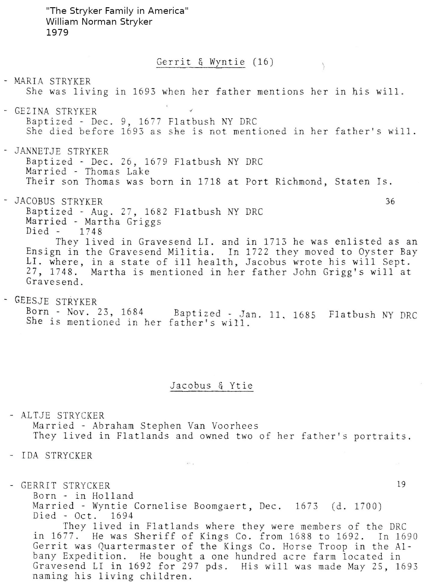 111.6 Martha Griggs Father - John Griggs Mother - 112.4 Metje Lake 111.7 Jacobus Gerrit Stryker Father - 124.0 Garret Stryker Mother - 125.0 Wyntje Cornelise Boomgard Timeline - 27 Aug 1682 Jacobus Gerrit Stryker baptized [1] [2] [7] [8] in Reformed Protestant Dutch Church, [1] [8] Flatbush, Kings County, New York [1] [2] [8] c1690 Martha Griggs born [3] [4] [6] in Manhattan, New York [3] [4] c1710 Martha Griggs and Jacobus Gerrit Stryker married [1] [4] [7] [8] in Kings County, New York [4] 1713 Jacobus Gerrit Stryker enlisted as an Ensign in Gravesend Militia [8] 1719 child #2, Mercy Jacobuse, born in Queens County, New York [6] 1722 moved to Oyster Bay, Town of Oyster Bay, Nassau County, New York [8] 20 May 1726 child #4, Garret, born [1] 1748 Martha Griggs died in Oyster Bay, Town of Oyster Bay, Nassau County, New York [3] [4] 27 Sep 1748 will of Jacobus Gerrit Stryker made [8] Jacobus Gerrit Stryker died [1] [4] [6] [8] in Long Island City, Queens County, [4] New York [4] [6] Notes - Jacobus Gerrit Stryker known as "Jacob"; [2] [7] lived in Gravesend, Kings County, New York; [8] buried in Upper Brookville, Oyster Bay, Nassau County, New York. [4] Child #2, Mercy, married Cornelius Van Cott. [1] Questions - Citation #4 says Jacobus Gerrit Stryker born 27 Aug 1682; baptized about 27 Aug 1682. [5] Citation #4 shows additional info for child #2, Mercy Jacobuse, but there appears to be errors. [5] Citation #6 refers to Martha Griggs as Maria John Griggs. [5] Citation #6 says Martha Griggs born in Gravesend, Kings County, New York. [5] Citation #6 says Martha Griggs and Jacobus Gerrit Stryker married c1704 in Long Island City, Queens County, New York. [5] Citation #6 refers to child #2, Mercy Jacobuse, as Mercy Marta. [5] Citation #7 says Jacobus Gerrit Stryker lived in New Jersey. [5] Citations - 1. "The Griggs Family of Gravesend, Kings County, New York & New Jersey", Perry Streeter, 27 Jul 2010 2. "Early Settlers of Kings County, Long Island, New York", Teunis G. Bergen, 1881, Misc->124.jpg 3. www.geni.com 4. familysearch.org 5. Marshall Edward Lake (1.0) <genealogy@mlake.net> 6. wikitree.com 7. "The Bergen Family", Teunis G. Bergen, 1876 8. Nancy McCombs (1.2358, child ii) <nmccombs@si-net.com>, "The Stryker Family in America", William Norman Stryker, 1979, Misc->111.1.jpg Children: 110.15 i. Wyntje. [1] [4] [6] ii. Mercy Jacobuse. [1] [4] 110.77 iii. John Jacobus. [1] [4] [6] 110.80 iv. Garret Jacobus. [1] [4] [6]