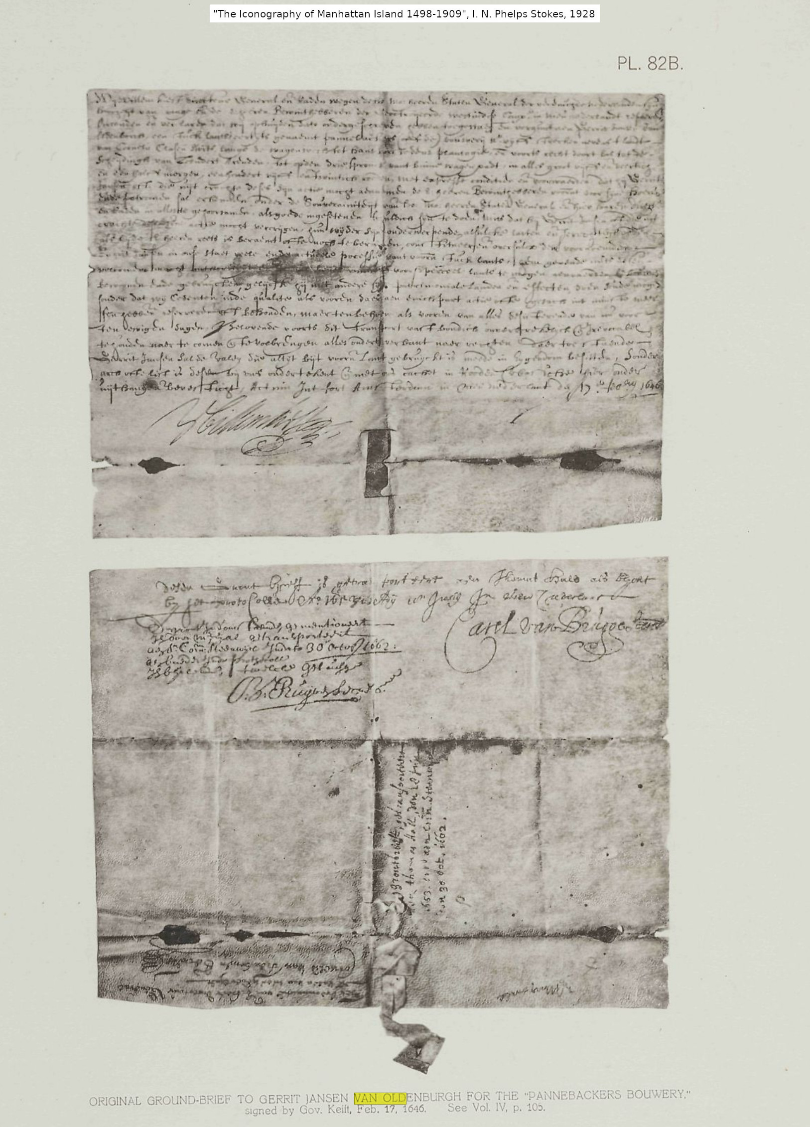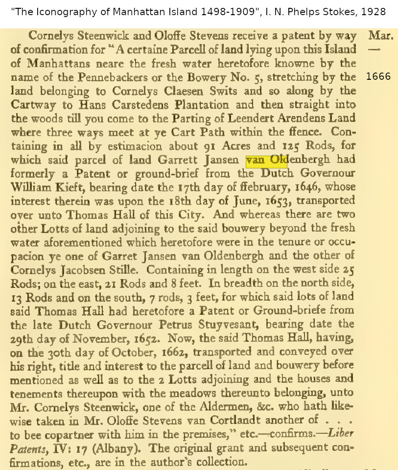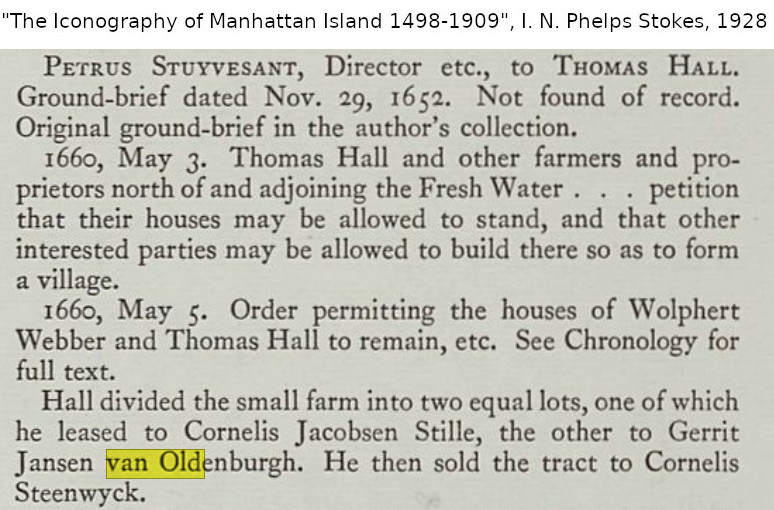 116.0 Gerrit Jansen van Oldenburg Father - name unknown Mother - name unknown 116.1 Clara Matthys Father - name unknown Mother - name unknown Timeline - c1605 Gerrit Jansen van Oldenburg born [2] [5] in Oldenburg, [2] Holy Roman Empire [6] c1610 Clara Matthys born [2] Jul 1632 Gerrit Jansen van Oldenburg working as a foreman [2] [5] for Kiliaen Van Rensselaer's farm in Manhattan Island [2] 1636 Gerrit Jansen van Oldenburg requested the grant of a farm from Kiliaen Van Rensselaer [2] May 1638 Gerrit Jansen van Oldenburg and Volkert Evertsen leased the farm "walensteyn" from Barent Dircksen [2] Jul 1638 Gerrit Jansen van Oldenburg sued by Teunis Nyssen for failure to deliver a cow [2] c1639 Gerrit Jansen van Oldenburg and Clara Matthys married [1] [2] May 1639 Gerrit Jansen van Oldenburg and Volkert Evertsen purchased the farm "walensteyn" from Barent Dircksen [2] 21 Jul 1639 Gerrit Jansen van Oldenburg charged with eloping with a widow [5] 1639 Gerrit Jansen van Oldenburg and Volkert Evertsen lease the farm "walensteyn" to Willem Willemsen and Jan Habsen [2] 1 Dec 1639 Issac Abrahamsen brought court action against Gerrit Jansen van Oldenburg [2] 1 Jul 1640 child #1, Anneken, baptized in Dutch Reformed Church, New Amsterdam, New Netherland [2] [5] 1 Nov 1641 Clara Matthys made a deposition [2] 28 Nov 1643 child #3, Abraham, baptized in Dutch Reformed Church, New Amsterdam, New Netherland [2] [5] child #4, Jacob, baptized in Dutch Reformed Church, New Amsterdam, New Netherland [2] [5] 17 Feb 1646 Gerrit Jansen van Oldenburg receives patent for 91 acres 125 rods in Manhattan, New Netherland [9] 16 Apr 1653 Gerrit Jansen van Oldenburg purchases land in New Utrech, Long Island, New Netherland [5] c1660 Gerrit Jansen van Oldenburg leased land in Manhattan, New Netherland from Thomas Hall [9] 1661 Gerrit Jansen van Oldenburg died in New Utrech, New Netherland [2] Notes - Gerrit Jansen van Oldenburg also known as "Gerrit Jansen De Mof", [2] "Gerrit de Mof", "Gerrit ye Muffe". [2] [5] Child #4, Jacob, died young. [2] [5] Child #3, Abraham, and child #4, Jacob, twins. [5] Questions - Citation #5 refers to Clara Matthys as Clara Mattheys. [6] Perhaps the parents of Clara Matthys are Johann Jakob Matthys (1580 Amsterdam, Noord-Holland, Netherlands - 1650 Amsterdam, Noord-Holland, Netherlands) and Stephania De Vierman (1580 Amsterdam, Noord-Holland, Netherlands - 1660 Amsterdam, Noord-Holland, Netherlands). And perhaps the father of Stephania De Vierman is Eol De Veirman (1558 - 1620). [8] Citation #9 refers to Gerrit Jansen van Oldenburg as Garrett Jansen van Oldenbergh and Gerrit Jansen van Oldenburgh. [6] Citations - 1. Perry Streeter <perry@streeter.com>, Misc->107.pdf 2. Sally A. Shreeve, 17 Mar 2002, Reference->116.txt 3. "The Garrisons of Amwell Township, Hunterdon County, New Jersey 1728-1775", Reference->114.txt 4. Phyllis J. Miller, Misc->114.5 5. family info, Reference->115.txt 6. Marshall Edward Lake (1.0) <genealogy@mlake.net> 7. The New York Genealogical and Biographical Society, July 1993: Volume 124, Issue 1, by Phillis Miller, pages 6-9 - family of Jacob Gerrits, Misc->115.2.pdf 8. Susan Avery <susanbaldeavery@gmail.com>, 5 Dec 2024 9. "The Iconography of Manhattan Island", I. N. Phelps Stokes, 1928, Misc->116.jpg, Misc->116.-2.jpg and Misc->116.-3.jpg Children: i. Anneken. [2] [5] 115.0 ii. Jan. [1] [2] [3] [5] iii. Abraham. [2] [5] iv. Jacob. [2] [5] 115.2 v. Jacob. [2] [4] [5] [7]