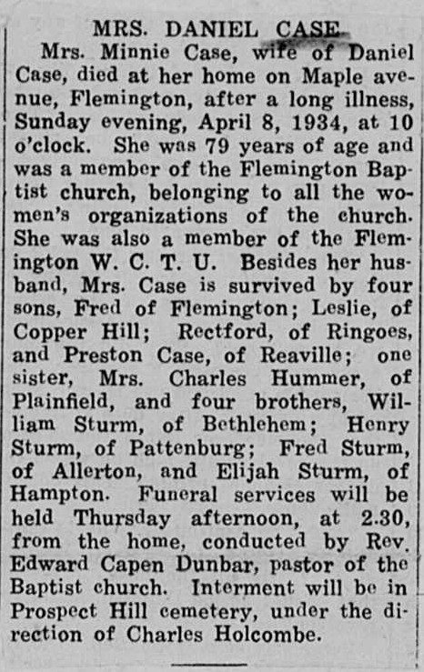 5.2300 Leslie Judson Case Father - 9.200 Daniel Pierson Case Mother - Minnie Sturm Timeline - 10 May 1883 Leslie Judson Case born [2] in New Jersey [1] c1907 Leslie Judson Case and Sadie J. ------ married [1] c1909 child #1, Frederick V. D., born in New Jersey [1] 1934 living in Copper Hill, Hunterdon County, New Jersey [3] 7 May 1943 Leslie Judson Case died [1] [2] Citations - 1. Donna Helen Tharp (1.551) <dokland@rcn.com> 2. Hunterdon Historical Newsletter, Hunterdon County Historical Society, Flemington, New Jersey, Winter 2006 (Volume 42, Number 1), Reference->9.200.txt and Records->Bible->9.200.jpg 3. obituary for Minnie Sturm (spouse of 9.200), Newspapers->Deaths->9.200.jpg Children: i. Frederick V. D. [1]
