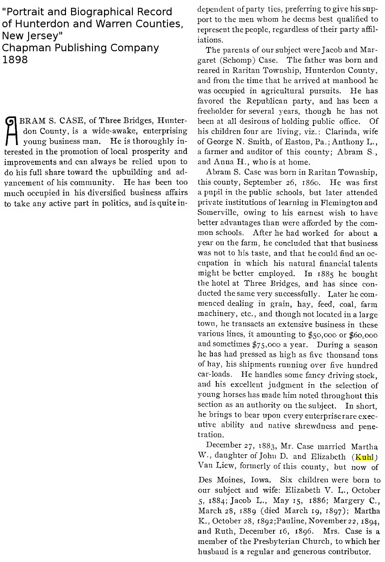 9.201 Elizabeth Bellis Kuhl Father - 19.55 Leonard Paul Kuhl Mother - Dorothy Ten Eyck Sutphin Timeline - 18 Jun 1838 John Dennis Van Liew born in Three Bridges, New Jersey [4] 24 Aug 1841 Elizabeth Bellis Kuhl born in Hunterdon County, New Jersey [4] 1861 John Dennis Van Liew living in Neshanic, New Jersey [7] living in Raritan Township, Hunterdon County, New Jersey [7] 20 Feb 1861 Elizabeth Bellis Kuhl and John Dennis Van Liew married by Rev. John L. Janeway [7] 27 Feb 1861 marriage announcement for Elizabeth Bellis Kuhl published in Hunterdon Gazette, Flemington, New Jersey [7] 6 Jun 1862 child #1, Martha Williamson, born in New Jersey [4] 13 Oct 1863 child #2, Hannah A., born in New Jersey 2 Jul 1865 child #3, Mary K., born in New Jersey [4] 25 Mar 1867 child #4, Richard K., born in New Jersey [4] 19 Sep 1869 child #5, Dennis John, born in Clover Hill, Hunterdon County, New Jersey 17 Feb 1870 child #3, Mary K., died [4] 2 Mar 1870 child #4, Richard K., died [4] 14 Feb 1872 child #6, Susan Higgins, born in Three Bridges, Hunterdon County, New Jersey 10 Sep 1874 child #7, Elizabeth K., born in New Jersey [4] 28 Jan 1877 child #8, John Edgar, born in New Jersey 1883 living in Weldon, Iowa [2] 1885 Dennis Van Liew acquired hay press and coal yard in Three Bridges, New Jersey from Oliver Kugler [1] 1890 Dennis Van Liew sold hay press and coal yard in Three Bridges, New Jersey to Abraham Schomp Case [1] 1898 living in Des Moines, Iowa [3] [8] 7 Jul 1916 Elizabeth Bellis Kuhl died [4] [9] in Des Moines, Iowa [4] 1928 child #7, Elizabeth K., died [4] 11 Jan 1928 John Dennis Van Liew died in Des Moines, Iowa [4] 2010 article mentioning Abraham Schomp Case published in Hunterdon Historical Newsletter, Hunterdon County Historical Society, Flemington, New Jersey [1] Notes - Elizabeth Bellis Kuhl known as "Lizzie"; [7] [9] buried in Woodland Cemetery, Des Moines, Iowa. [9] John Dennis Van Liew son of Dennis Van Liew and Hannah Williamson. [4] Questions - Citation #5 says Elizabeth Bellis Kuhl born 25 Aug 1841. [6] Citation #9 says Elizabeth Bellis Kuhl born 24 Aug 1839. [6] Citation #9 says Elizabeth Bellis Kuhl and John Dennis Van Liew married 22 Feb 1861. [6] Citations - 1. Hunterdon Historical Newsletter, Hunterdon County Historical Society, Flemington, New Jersey, Misc->3.535.jpg 2. marriage announcement for Martha Williamson Van Liew (5.353), Reference->5.353.txt 3. "Portrait and Biographical Record of Hunterdon and Warren Counties New Jersey", Chapman Publishing Company, 1898, Reference->5.353.txt and Biographies->5.353.jpg 4. "The Kuhl Family of Hunterdon County, New Jersey", Michael Gesner <mgesner@yahoo.com> and John William Kuhl <jkuhl@patmedia.net> (3.358, child i), 2012 5. Gladys Royer <royerg@juno.com>, 25457 C.R. 32, Goshen, Indiana 46526 6. Marshall Edward Lake (1.0) <genealogy@mlake.net> 7. marriage announcement for Elizabeth Bellis Kuhl (9.201), Reference->9.201.txt and Newspapers->Marriages->9.201.jpg 8. "Portrait and Biographical Record of Hunterdon and Warren Counties New Jersey", Chapman Publishing Company, 1898, Biographies->19.55ch-iv.jpg 9. John William Kuhl <jkuhl@patmedia.net> (3.358, child i), Misc->85.-2 10. Hunterdon County Historical Society, Misc->5.353.jpg Children: 5.353 i. Martha Williamson. [4] [10] 5.1144 ii. Hannah A. [4] iii. Mary K. [4] iv. Richard K. [4] 5.1145 v. Dennis John. [4] 5.1146 vi. Susan Higgins. [4] vii. Elizabeth K. [4] 5.1147 viii. John Edgar. [4]