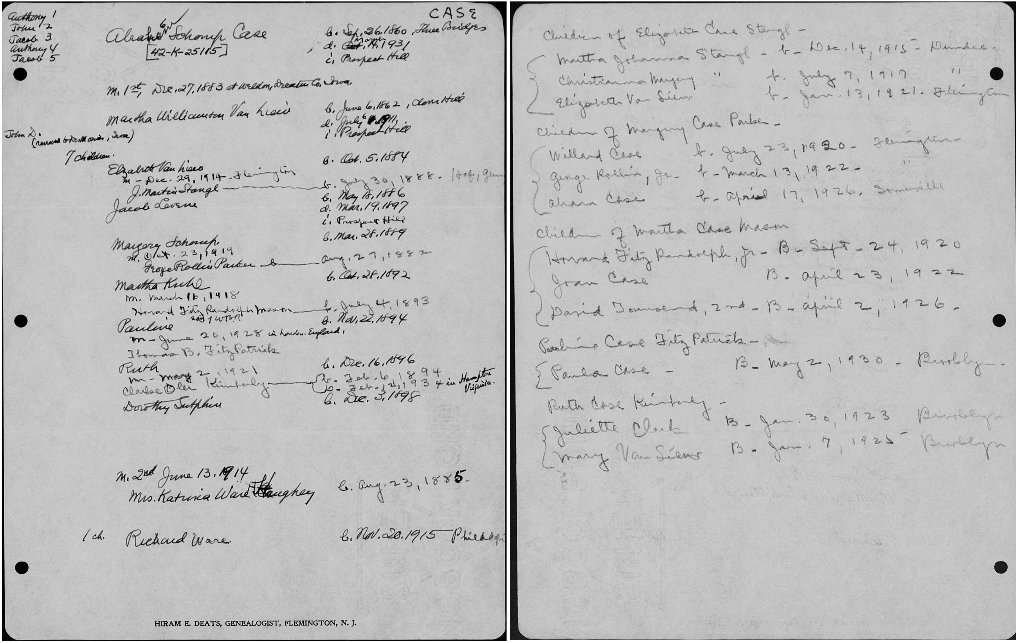 9.199 Joseph D. Case Father - 19.62 David A. Case Mother - Susan Rebecca Pierson Timeline - 18 Mar 1841 Joseph D. Case born in Raritan Township, Hunterdon County, New Jersey [1] 23 Dec 1865 Joseph D. Case and Lucretia Willson married in Franklin Township, Hunterdon County, New Jersey [1] 8 Apr 1867 child #1, Samuel Willson, born in New Jersey [1] 11 Feb 1870 child #2, Minerva, born in New Jersey [1] 1880 Joseph D. Case working as a farmer in Delaware Township, Hunterdon County, New Jersey [1] 1898 living in Delaware Township, Hunterdon County, New Jersey [2] 1944 living in Lambertville, Hunterdon County, New Jersey [3] Notes - Joseph D. Case worked as a blacksmith; lived in Stockton, Hunterdon County, New Jersey; lived in Lambertville, Hunterdon County, New Jersey. [1] Lucretia Willson daughter of Samuel Willson and Amanda Swallow. [1] Citations - 1. Donna Helen Tharp (1.551) <dokland@rcn.com> 2. "Portrait and Biographical Record of Hunterdon and Warren Counties New Jersey", Chapman Publishing Company, 1898, Reference->9.200.txt and Biographies->9.200.jpg 3. Hunterdon Historical Newsletter, Hunterdon County Historical Society, Flemington, New Jersey, Winter 2006 (Volume 42, Number 1), Reference->9.200.txt and Records->Bible->9.200.jpg Children: i. Samuel Willson. [1] ii. Minerva. [1]