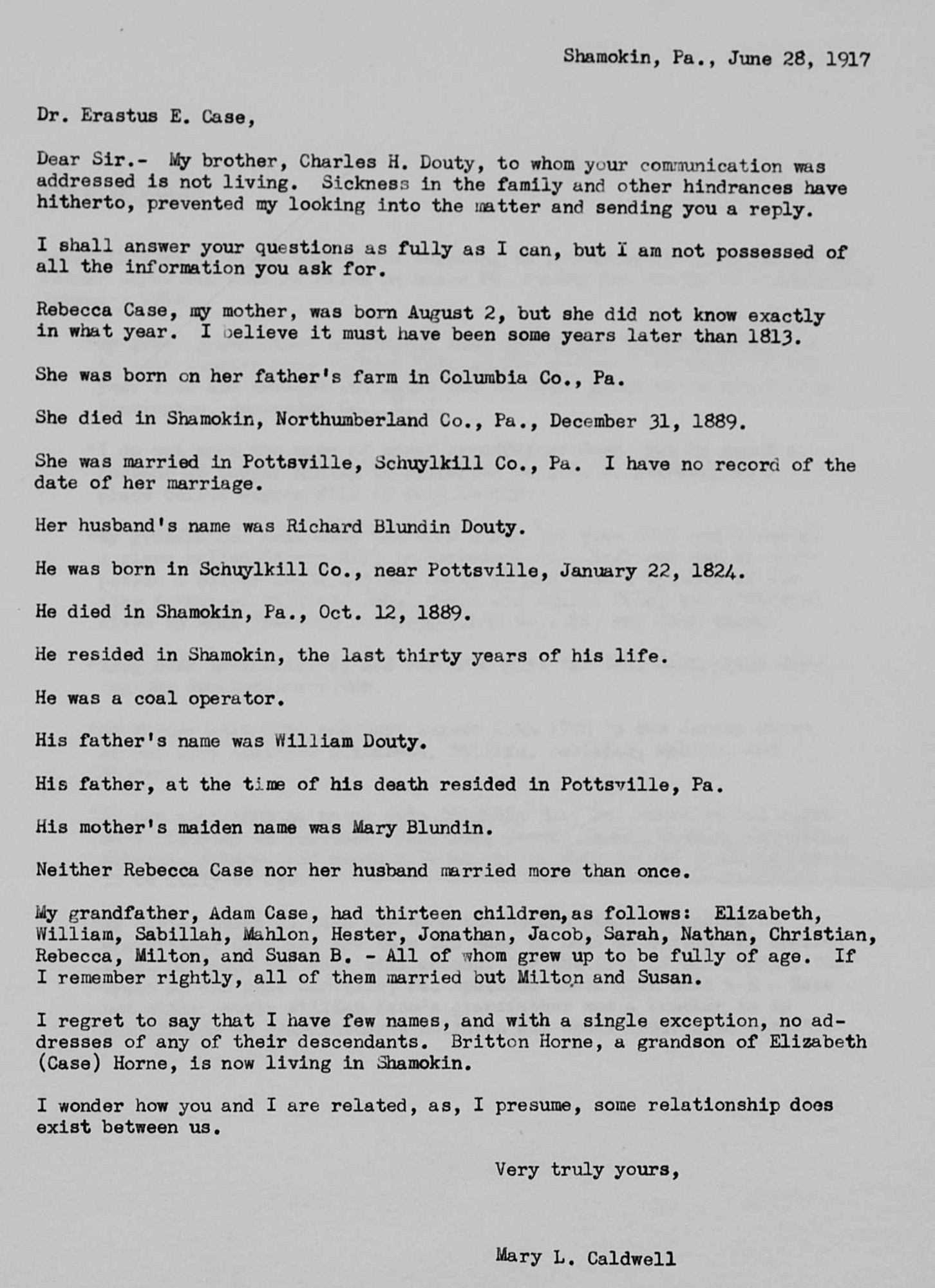 19.370 Rebecca Case Father - 32.84 Adam Case Mother - Ann Bodine Timeline - 1 Aug 1813 Rebecca Case born [1] in Columbia County, Pennsylvania [2] 22 Jan 1824 Richard Blundin Douty born near Pottsville, Schuylkill County, Pennsylvania [2] 1859-1889 living in Shamokin, Northumberland County, Pennsylvania [2] 12 Oct 1889 Richard Blundin Douty died in Shamokin, Northumberland County, Pennsylvania [2] 31 Dec 1889 Rebecca Case died in Shamokin, Northumberland County, Pennsylvania [2] Notes - Rebecca Case married Richard Blundin Douty in Pottsville, Schuylkill County, Pennsylvania. [2] Richard Blundin Douty worked as a coal operator; son of William Douty and Mary Blundin. [2] Child #2, Mary L., married ------ Caldwell. [2] Questions - Citation #2 says Rebecca Case born 2 Aug after 1813. [3] Citations - 1. "Early Germans of New Jersey", Theodore Frelinghuysen Chambers, 1895, Misc->88.jpg 2. Hunterdon County Historical Society, Misc->19.370.jpg 3. Marshall Edward Lake (1.0) <genealogy@mlake.net> Children: i. Charles H. [2] ii. Mary L. [2]