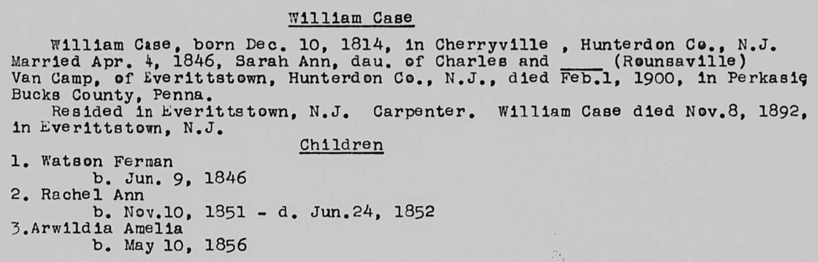 19.371 William Case Father - 32.15 William Case Mother - Rachel Evans Timeline - 10 Dec 1814 William Case born in Cherryville, Hunterdon County, New Jersey [1] [5] 1824 Sarah Ann VanCamp born [6] 1846 Sarah Ann VanCamp living in Alexandria Township, Hunterdon County, New Jersey [4] 4 Apr 1846 William Case and Sarah Ann VanCamp married [2] [5] in Kingwood Township, [4] Hunterdon County, New Jersey [2] [4] 3 Jun 1846 marriage notice for William Case published in Hunterdon County Democrat, Flemington, Hunterdon County, New Jersey [4] 9 Jun 1846 child #1, Watson Fernan, born [5] 10 Nov 1851 child #2, Rachel Ann, born [5] 24 Jun 1852 child #2, Rachel Ann, died [5] 10 May 1856 child #3, Arwildia Amelia, born [5] 1880 living in Alexandria Township, Hunterdon County, New Jersey [1] 8 Nov 1892 William Case died in Everittstown, Hunterdon County, New Jersey [1] [5] 1 Feb 1900 Sarah Ann VanCamp died [5] [6] in Perkasie, Bucks County, Pennsylvania [5] Notes - William Case worked as a carpenter; lived in Everittstown, Hunterdon County, New Jersey. [1] [5] Sarah Ann VanCamp daughter of Charles Van Camp and Sarah Rounsavell. [5] [6] Questions - Citation #4 indicates 1846 William Case and Sarah Ann VanCamp married 4 May 1846. [3] Citation #5 refers to Rounsavell as Rounsaville. [3] Citations - 1. Donna Helen Tharp (1.551) <dokland@rcn.com> 2. "Marriage Index: New Jersey, 1680-1900", Broderbund Software, 1998, Reference->32.15.txt 3. Marshall Edward Lake (1.0) <genealogy@mlake.net> 4. marriage notice for William Case (32.15, child xii), Reference->32.15.txt 5. Hunterdon County Historical Society, Misc->19.371.jpg 6. Marfy Goodspeed <marfyg@gmail.com> Children: i. Watson Fernan. [5] ii. Rachel Ann. [5] iii. Arwildia Amelia. [5]